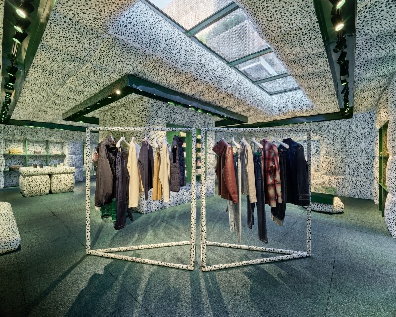 Bottega Veneta快闪店内55坪的店内空间,从外到内都呼应品牌的经典设计,运用的图样也让人联想到品牌门店所使用的建筑元素、材料、饰面工艺等等的火山釉,店内的陈列架混搭上抢眼的代表色Bottega Veneta绿色,店中许多看似毫不费力地物件配置,也是透过手工缝製精心製造而成的,展示着全新的 2024早春系列男、女装,其中也包括品牌大使舒淇拍摄形象照时所搭配的Gemelli包款在其中。