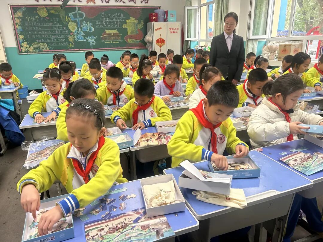 在昌吉市第五小学,山西博物院向学校捐赠了《晋地奇旅》拼图、青铜文物涂色卡、非遗体验包等资源,助力建设“山西博物院读书角”。三年级学生吕俊希在拼搭晋祠博物馆积木冰箱贴后兴奋地说:“亲手拼出古建筑模型,仿佛穿越到了千年前的山西!”
